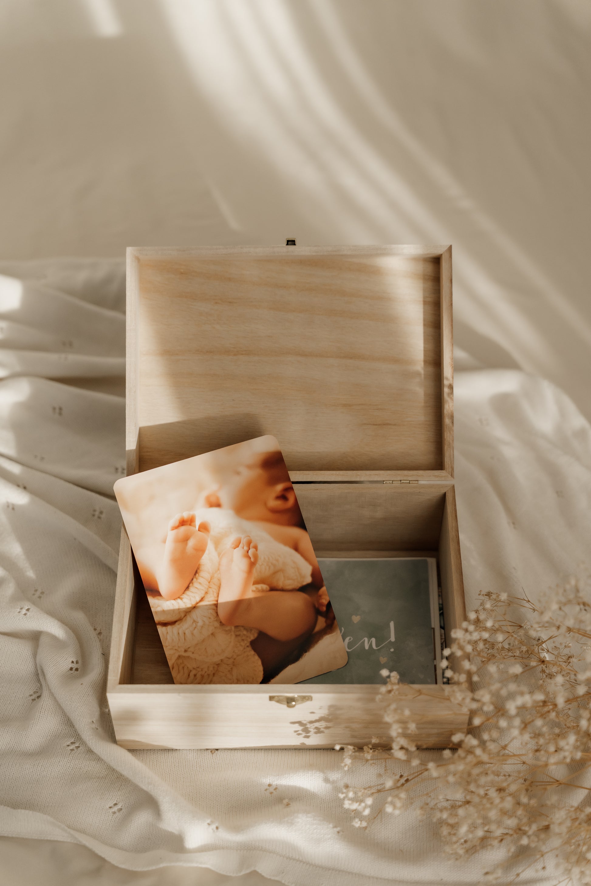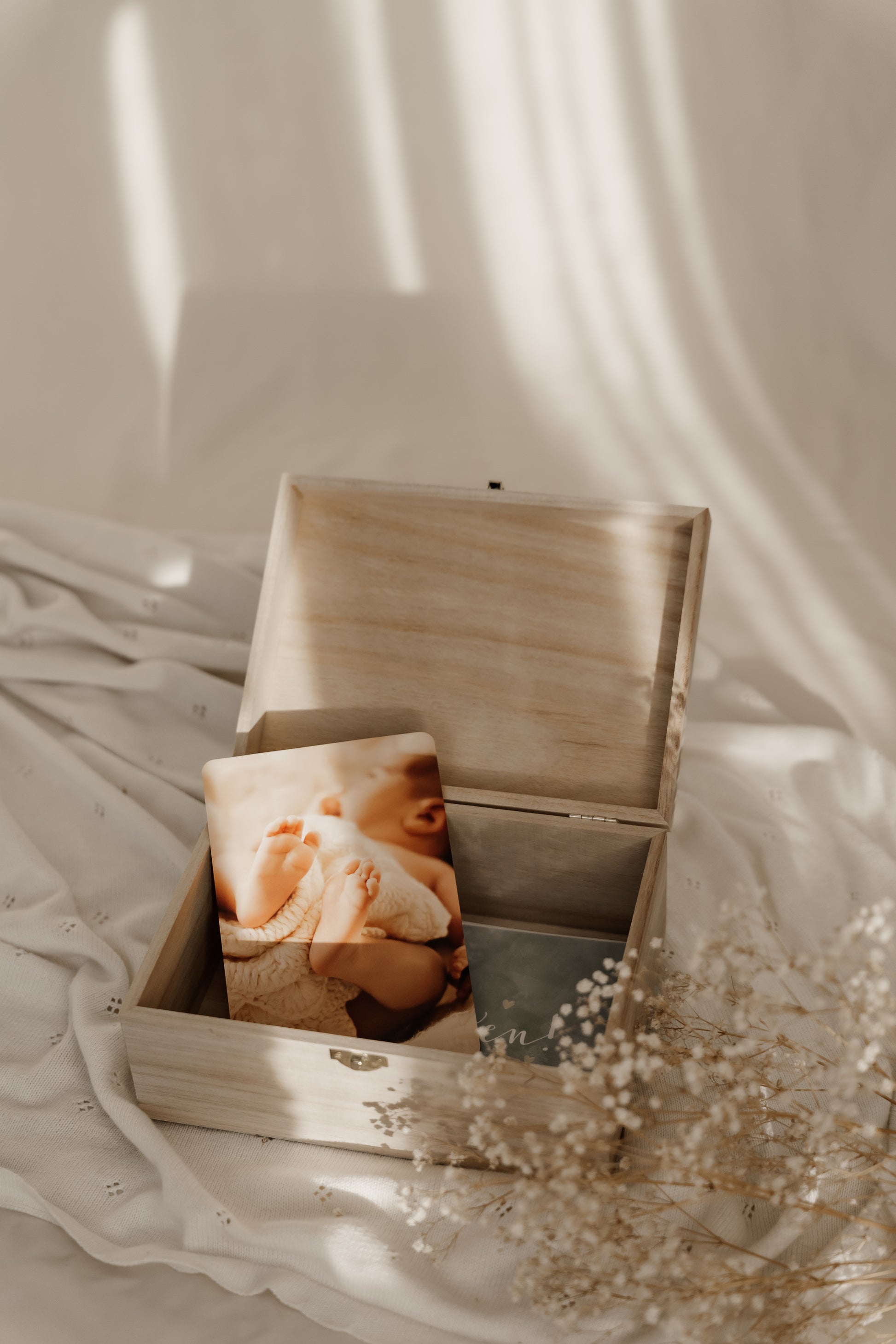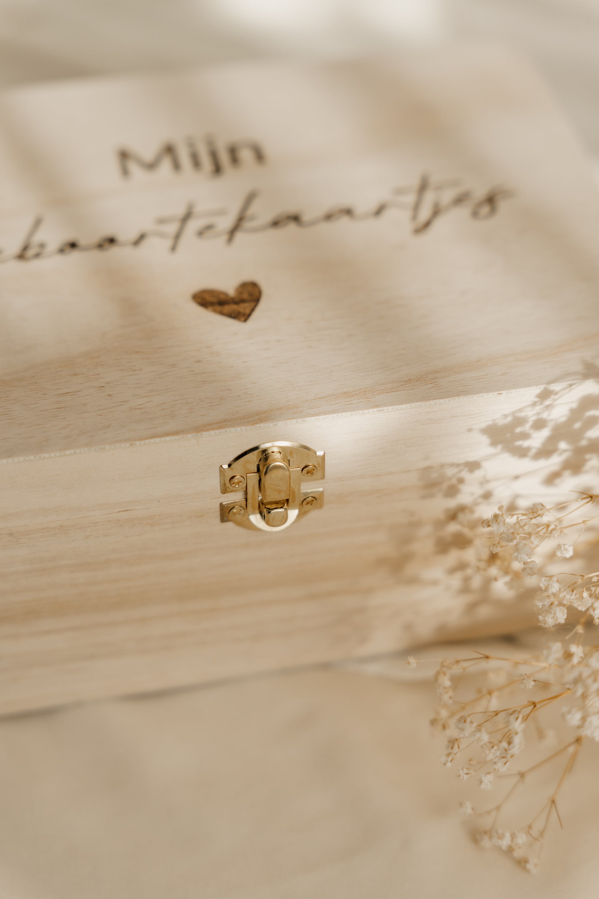 De doos is gemaakt van hout en voorzien van een lasergegraveerde tekst op het deksel: subtiel, blijvend en met veel aandacht voor detail. Een prachtig kraamcadeau of een waardevol item voor je eigen babyuitzet.