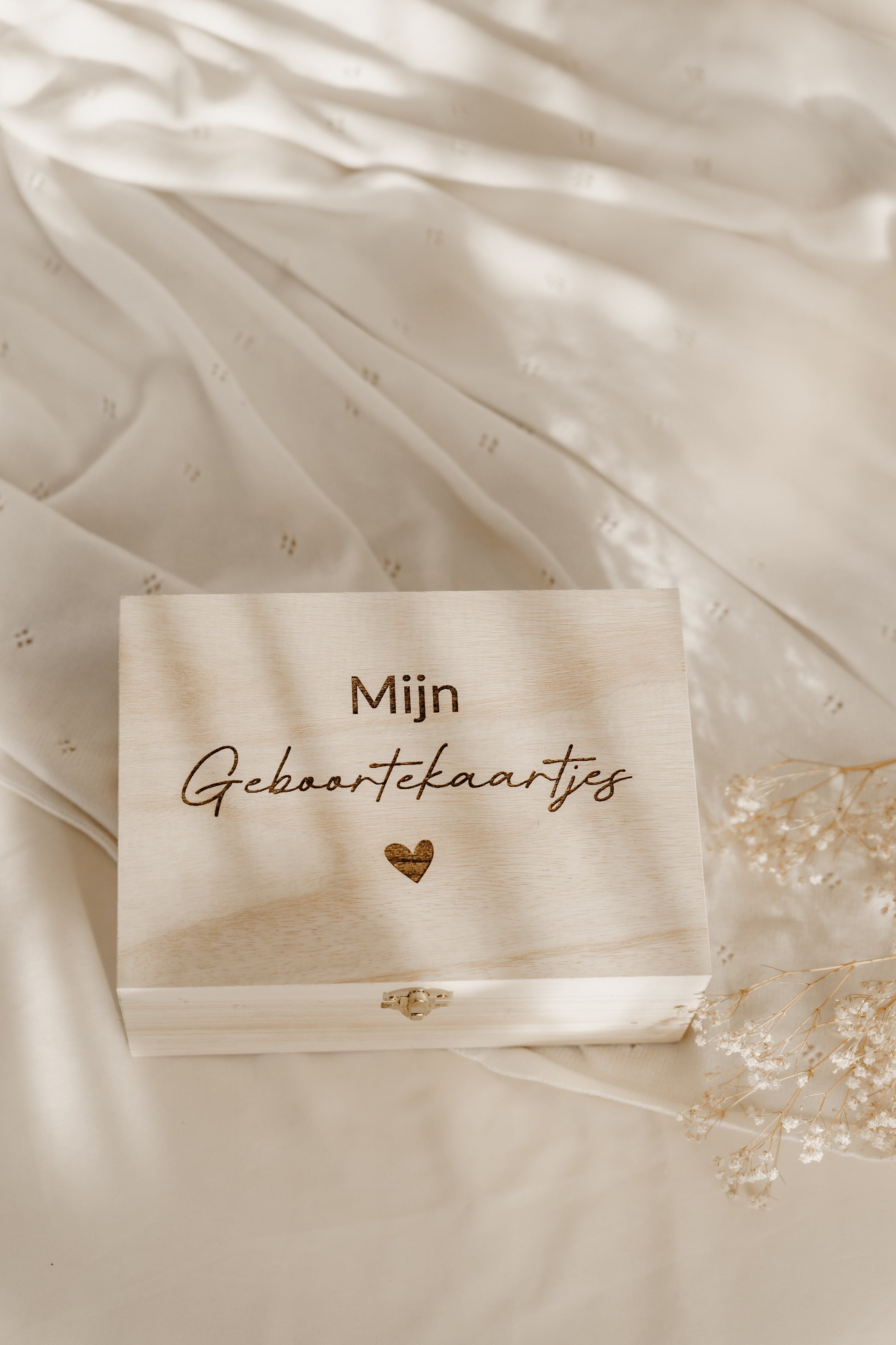 Deze houten bewaardoos is speciaal ontworpen om jouw geboortekaartjes veilig én stijlvol te bewaren. Met een binnenmaat van 21,7 x 15,4 x 7,2 cm is er voldoende ruimte voor alle dierbare kaartjes die je hebt ontvangen bij de geboorte van je kleintje.