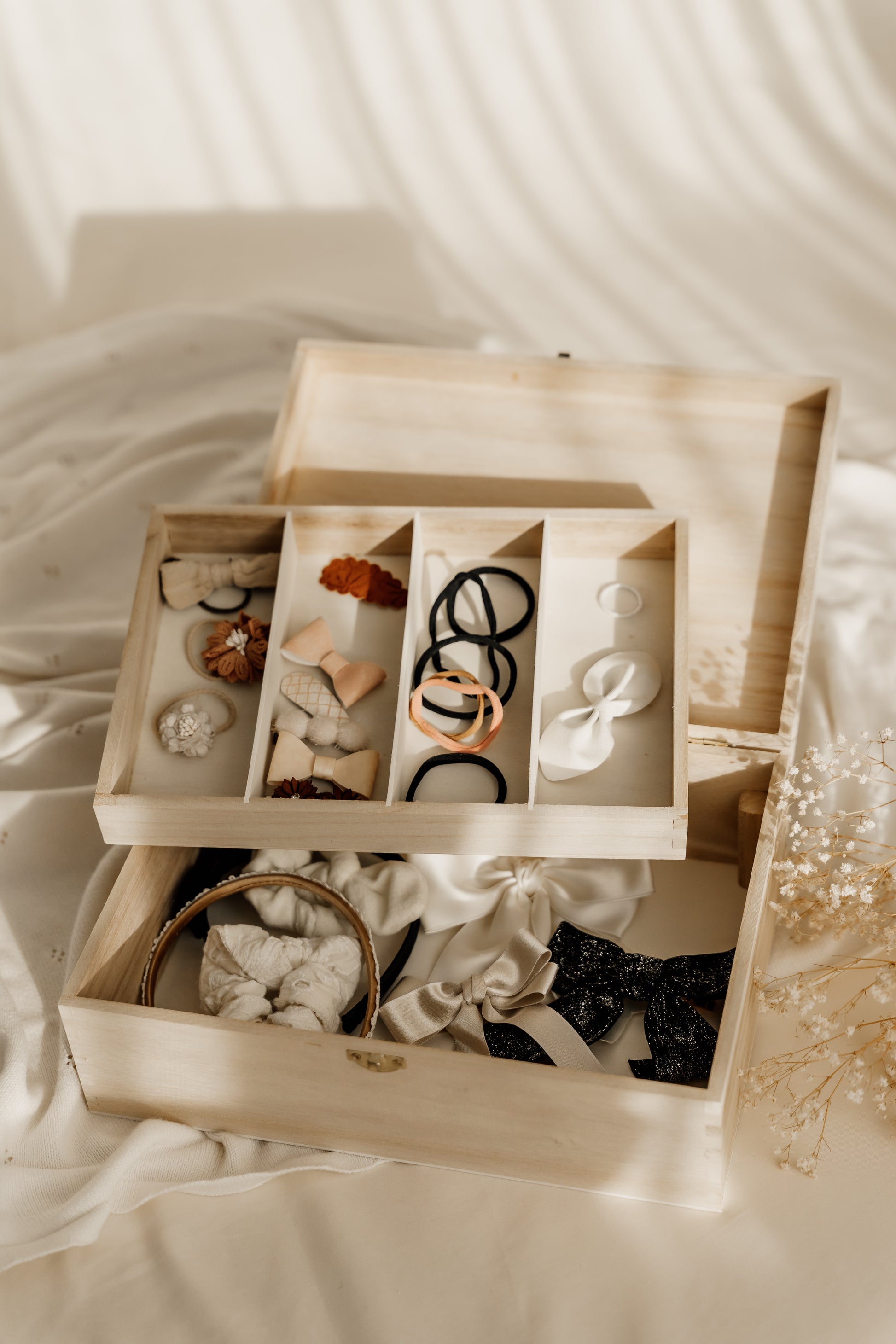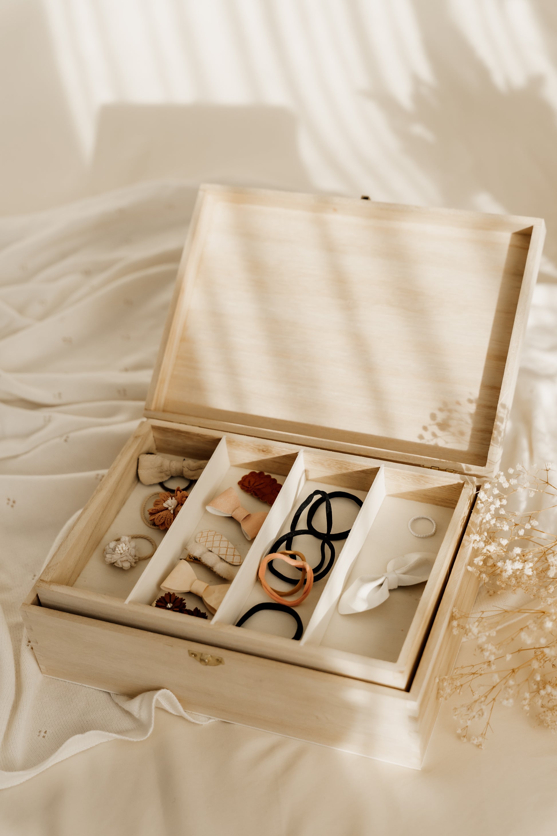 De bewaardoos is gemaakt van hout en heeft handige vakken om elastiekjes, speldjes, haarbandjes en andere accessoires netjes op te bergen. Dankzij het natuurlijke, tijdloze design staat de doos mooi in iedere kinderkamer.