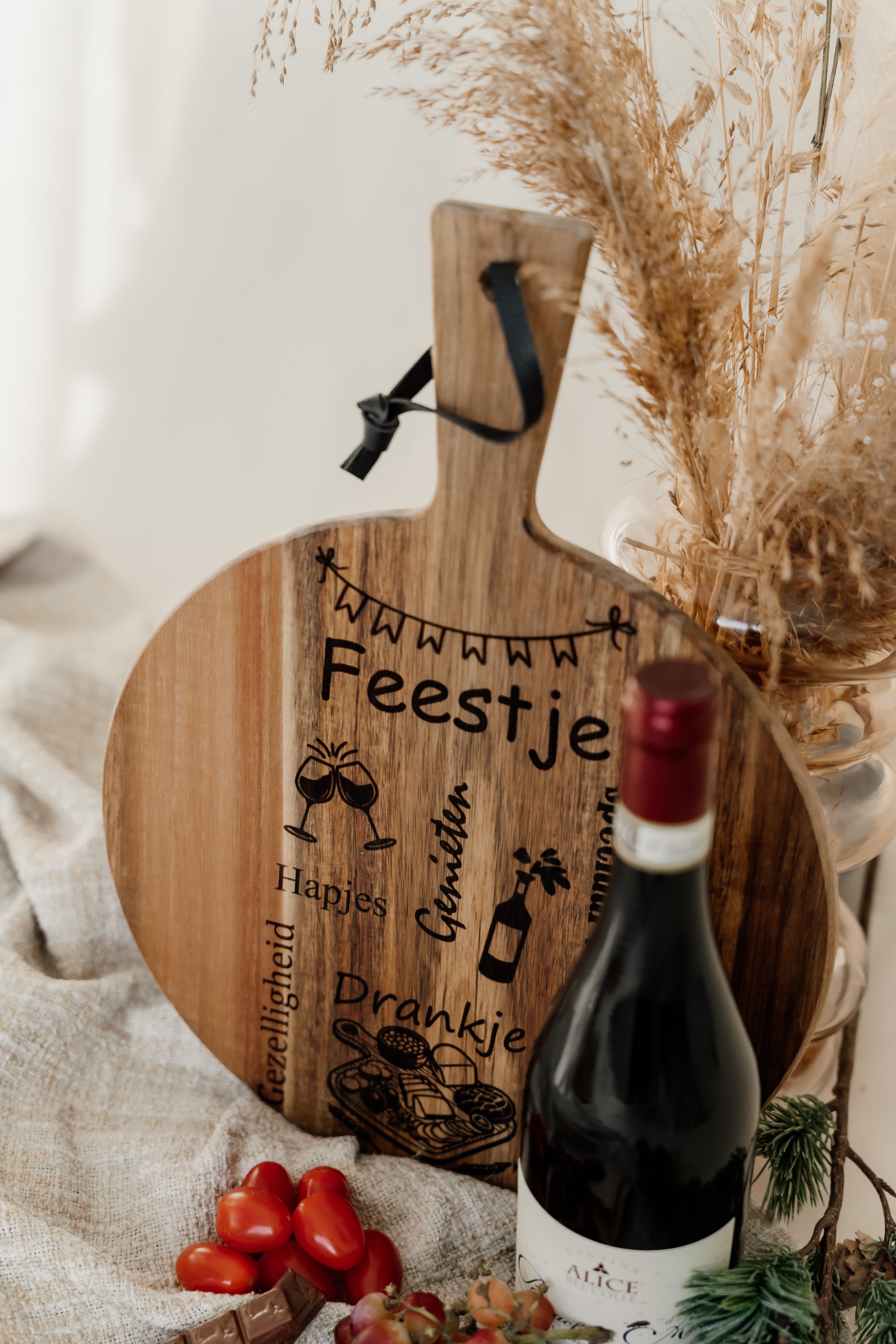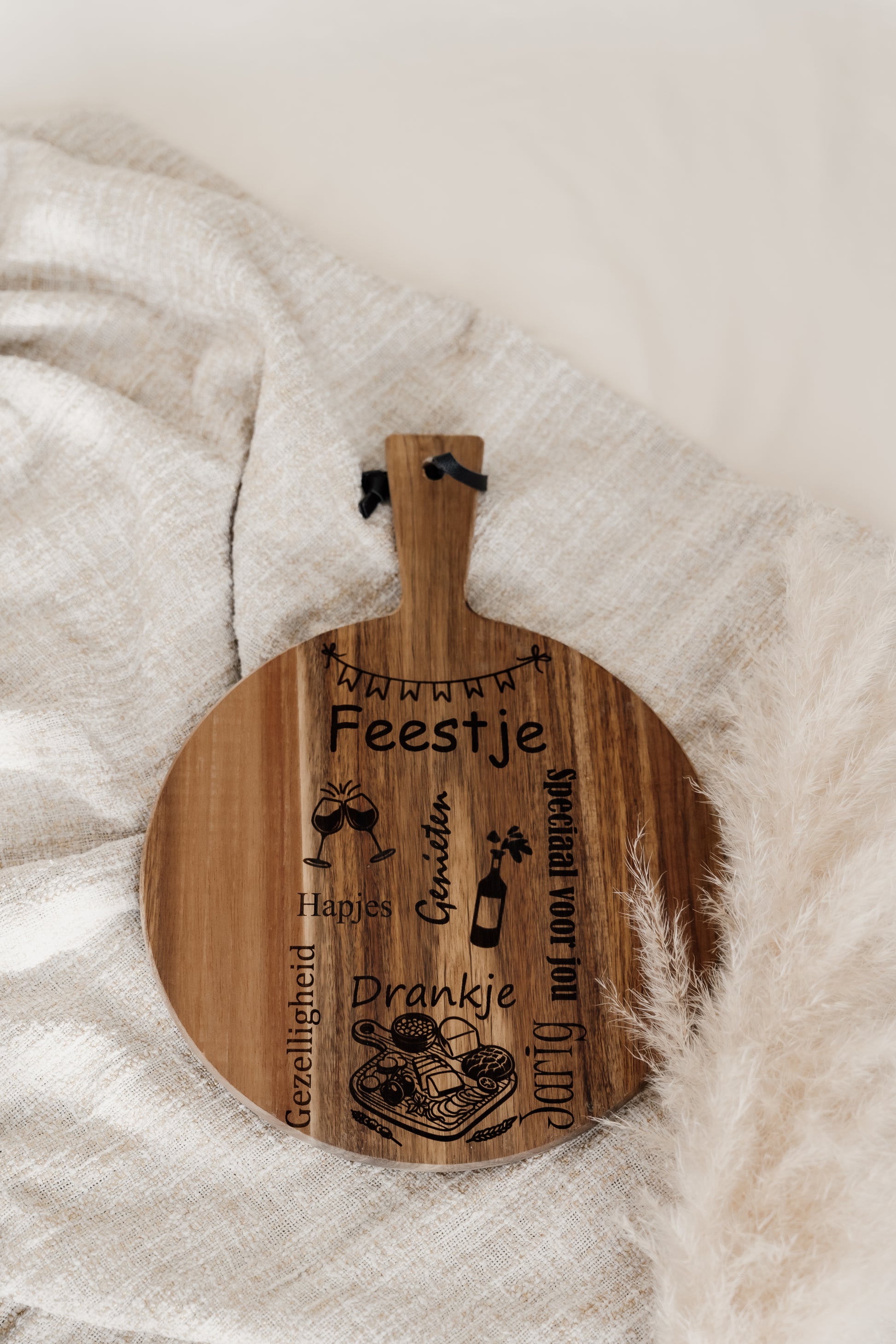 Een prachtige lasergegraveerde tekst zorgt ervoor dat de snijplank/hapjesplank uniek is.