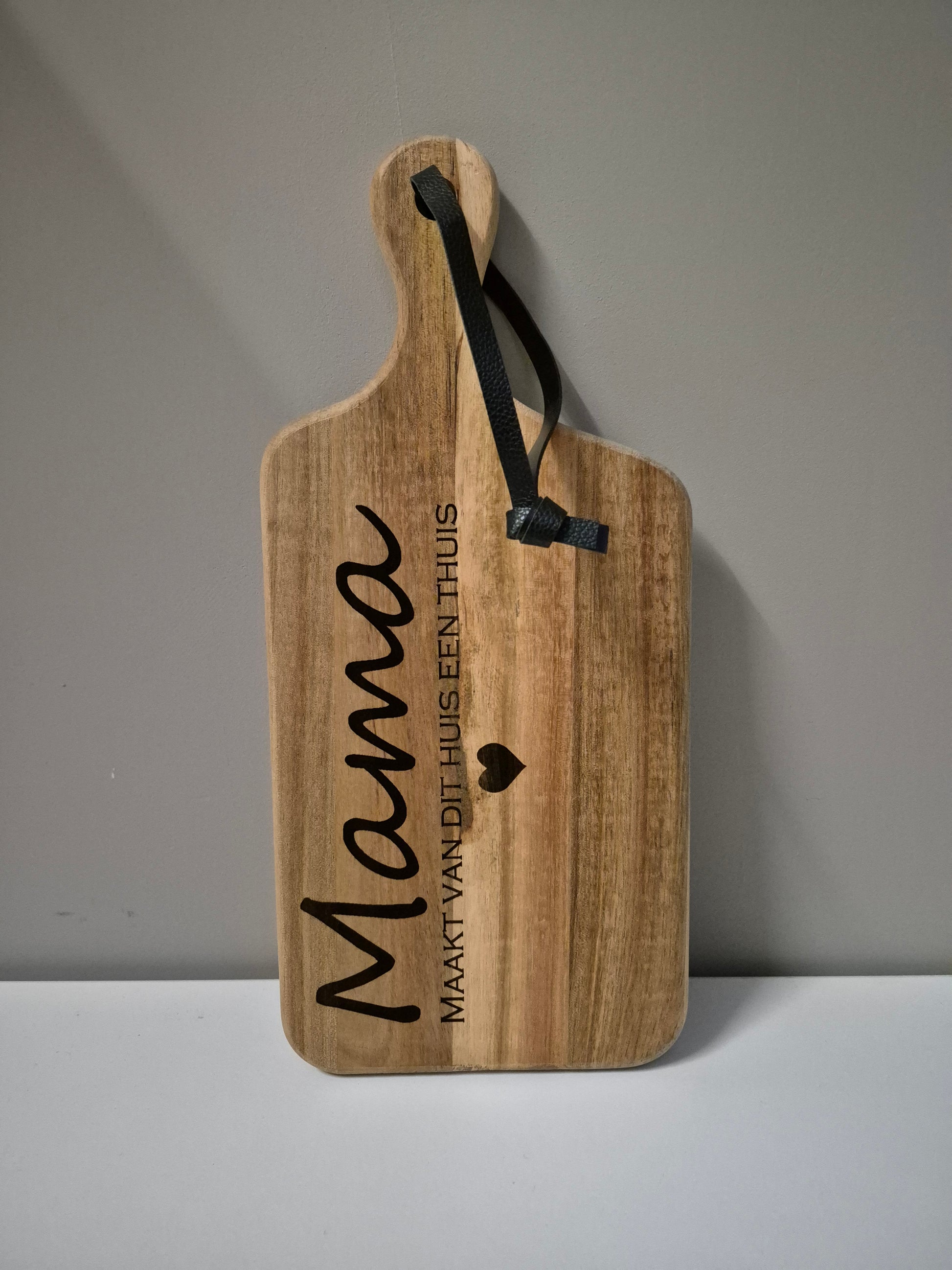 Een prachtige lasergegraveerde tekst zorgt ervoor dat de snijplank/hapjesplank uniek is.